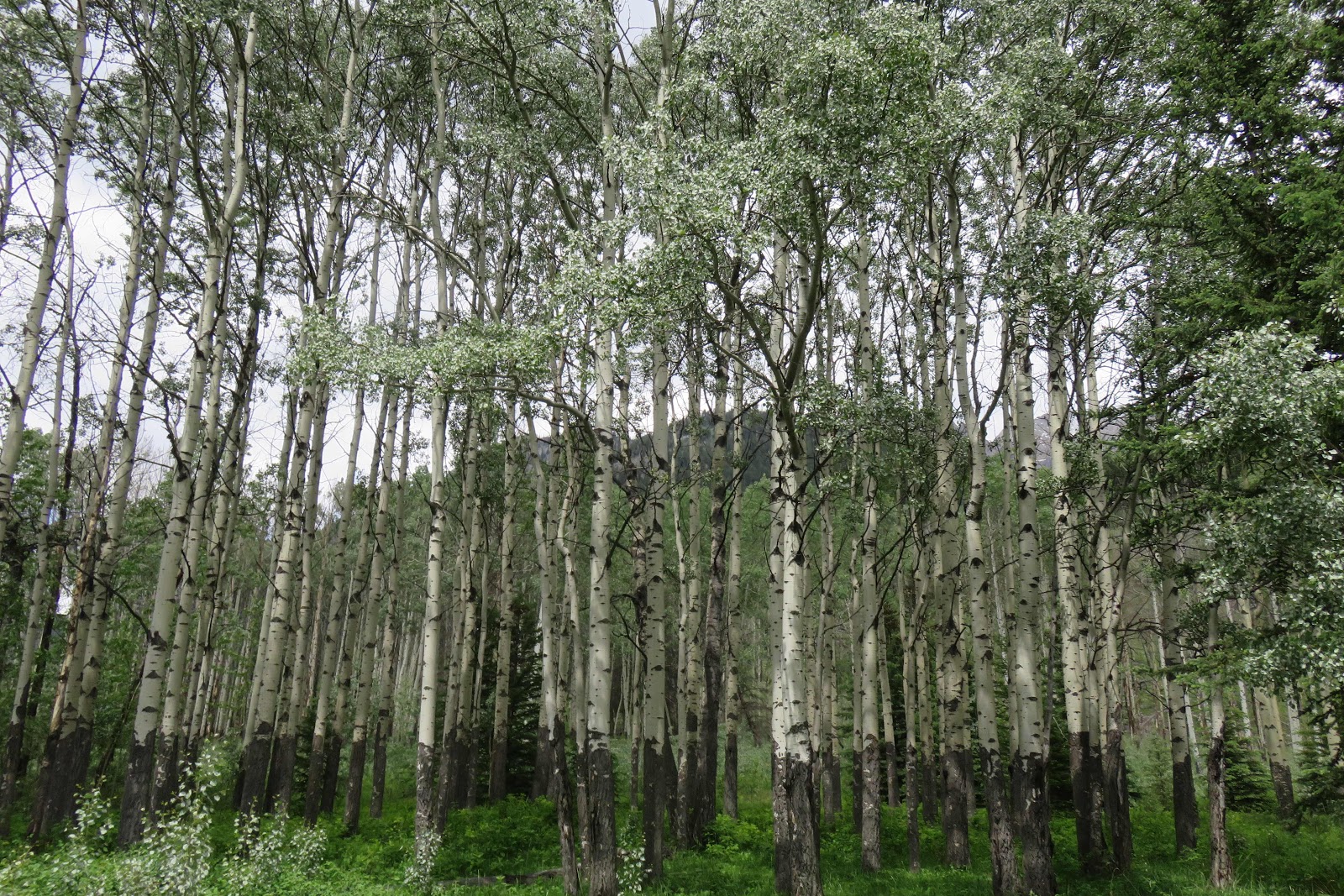 Aspens are beautiful trees with white bark striped with black which usually grow as clones of a mother tree. The small pale leaves seem to shiver in the wind giving them the name “quaking aspens”. Their leaves have a lovely whispering sound, turn brilliant yellow in the fall, and are clumps of a lighter shade of green on the mountain side and valleys.