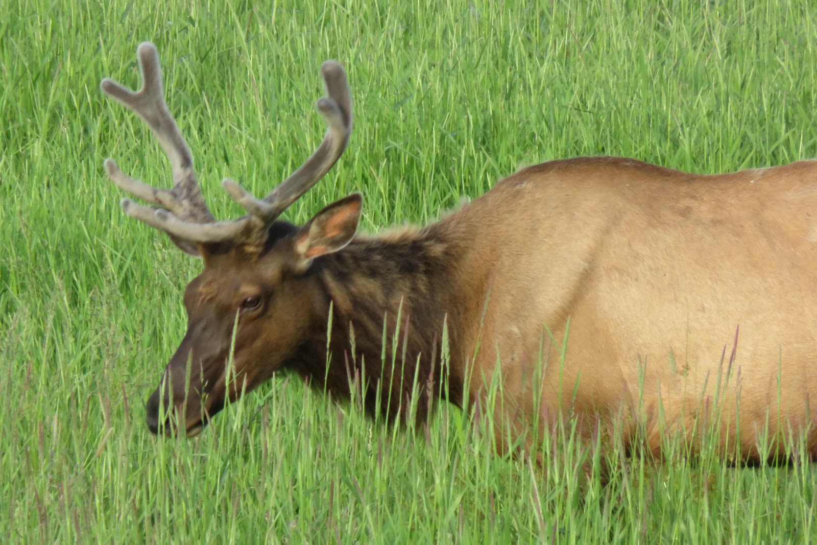 Males have velvet covered antlers...some just nubs, but since this is spring and females have recently calfed, there is no aggression and fight for dominance. I am so blessed these creatures chose to feed right by the road tonight!